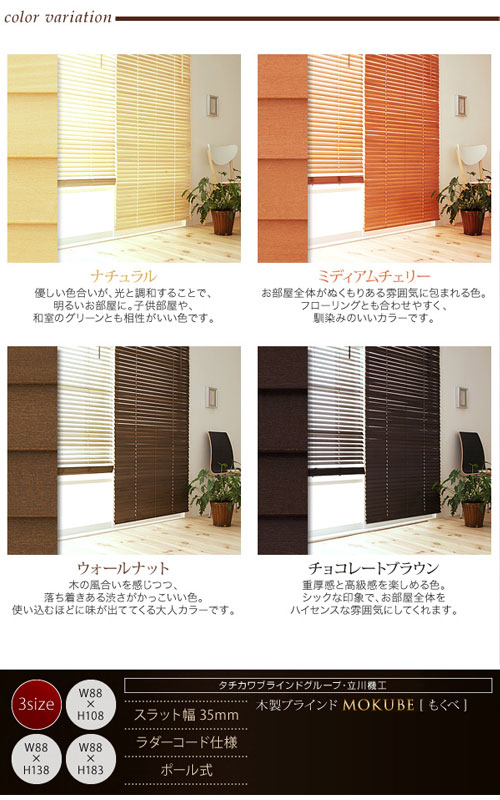 商品名木製ブラインド MOKUBE(モクベ) 幅88×高さ108cm 商品仕様材質:バスウッド、アルミ、スチール 商品サイズ(約)幅88cm×高さ108cmスラット(羽)の幅:3.5cm 商品重量(約)2.5kg 梱包サイズ(約)幅17cm×奥行7cm×高さ95cm 梱包重量(約)2.8kg 梱包数1個口 生産国中国 組み立て完成品 注意事項沖縄・北海道・一部離島の配送には別途運賃がかかります。