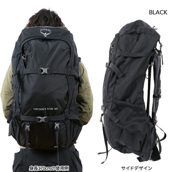 ITEM SPEC Brand OSPREY(オスプレー) Item Name ファーポイントトレック 55 Color ・BLACK Size サイズ計測方法は SIZE CHARTを ご確認ください 《ONEサイズ》 W39cm / H72cm / D31cm / 容量55L / 重量1.92kg Material メイン:420HDナイロンパッククロス アクセント:500HDナイロンパッククロス ボトム:500HDナイロンパッククロス Featured 多様に使えるフロントのストラップ 大きく開くメインコンパートメント PC収納可能な内側ポケット ショルダーベルトにポケット付 AirSpeedバックパネル デイライト(別売バックパック)とアタッチメントが可能 着脱式スリーピングパッドストラップ Notice ▼長時間濡れたままで重ねて置いたり、摩擦(特に湿った状態での摩擦)や、汗や雨などでぬれた時は他の衣料等に移染する場合がございますのでお気を付け下さいませ。