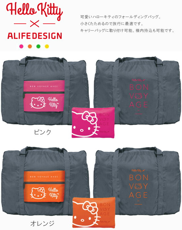 【検索ワード】 トラベル用品/トラベルグッズ/トラベル小物/旅行小物/旅行雑貨/トラベル雑貨/可愛い/折り畳みカバン/折りたたみバッグ/折りたたみボストンバッグ/キティー柄/キティ柄/キティグッズ/ポケッタブルバッグ/大型かばん/海外旅行グッズ/サブバッグ/エコバッグ/修学旅行/合宿/お土産/持ち歩き/プレゼント/キャラクターグッズ/機内持ち込み/シンプル/コンパクト/ポケッタブルバッグ/ローズ/ピンク/オレンジ/グリーン/緑/イエロー/黄色/【RCP】**** 揃えて楽しい!ALIFE(アリフ)シリーズはこちら! **** ******************** 大人気アリフとハローキティがコラボしたフォールディングバッグ。